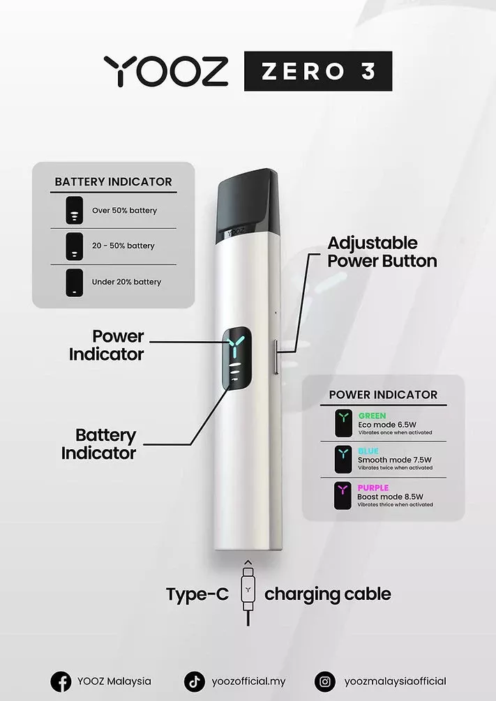 The YOOZ V3 is a next-generation pod device that gives you full control over your vape experience. With adjustable power settings, this sleek and modern vape lets users fine-tune vapor intensity to suit their personal preference. It features a 500mAh rechargeable battery, Type-C fast charging, and is compatible with all YOOZ pods. The LED battery indicator and buttonless draw activation make the V3 both smart and effortless to use.
